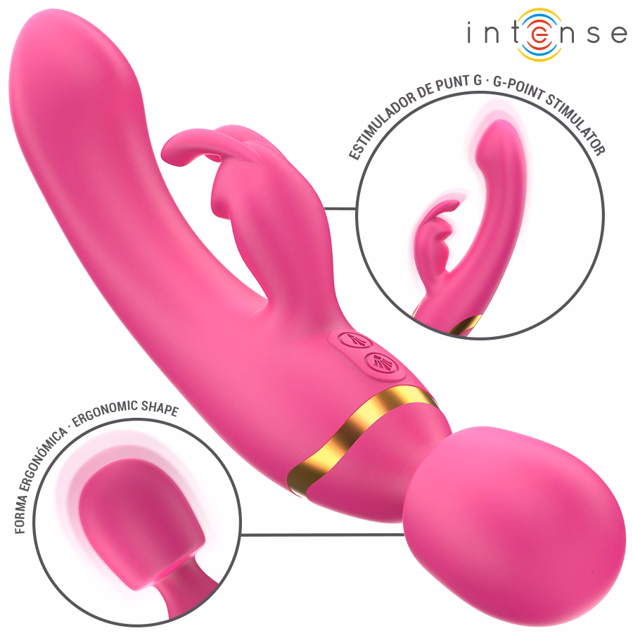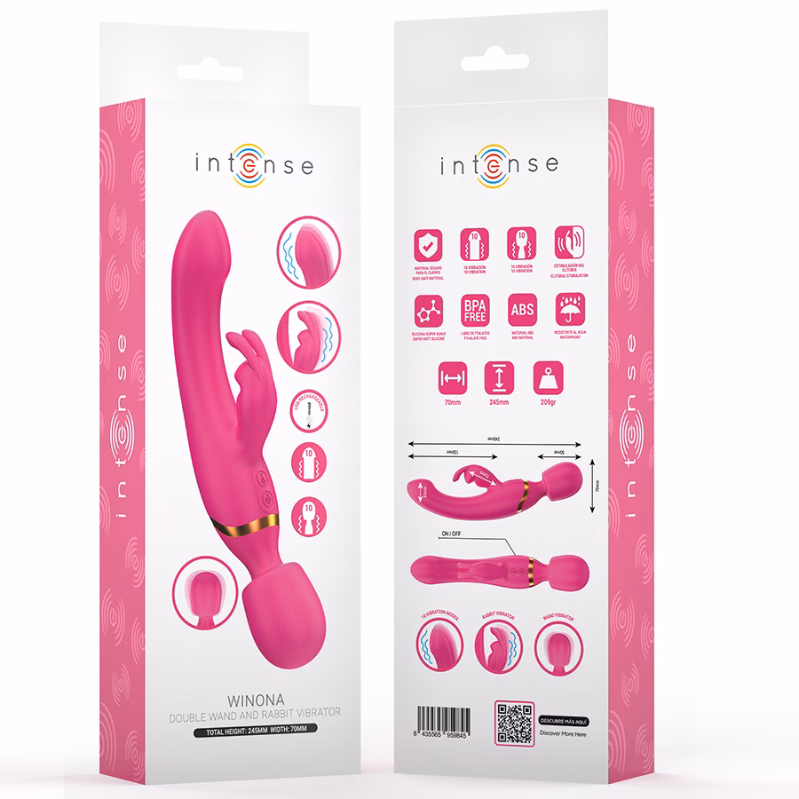 Winona doble vibrador Rabbit & Wand de Intense es la fusión perfecta entre tecnología, diseño y placer. Su innovador formato 2 en 1 combina un estimulador tipo rabbit con un potente vibrador tipo wand, ofreciendo una experiencia completa para satisfacer todas tus fantasías. Ya sea para la estimulación del Punto·G, el clítoris o cualquier otra zona erógena, Winona ha sido diseñado para adaptarse a tus deseos y acompañarte en cada momento de placer.