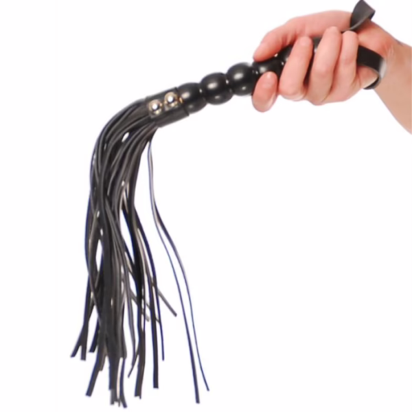 Látigo de 52 cm con mango de madera acanalado y correa para mayor agarre. Tiene varias trenzas fabricadas en vinillo y muy fáciles de limpiar .