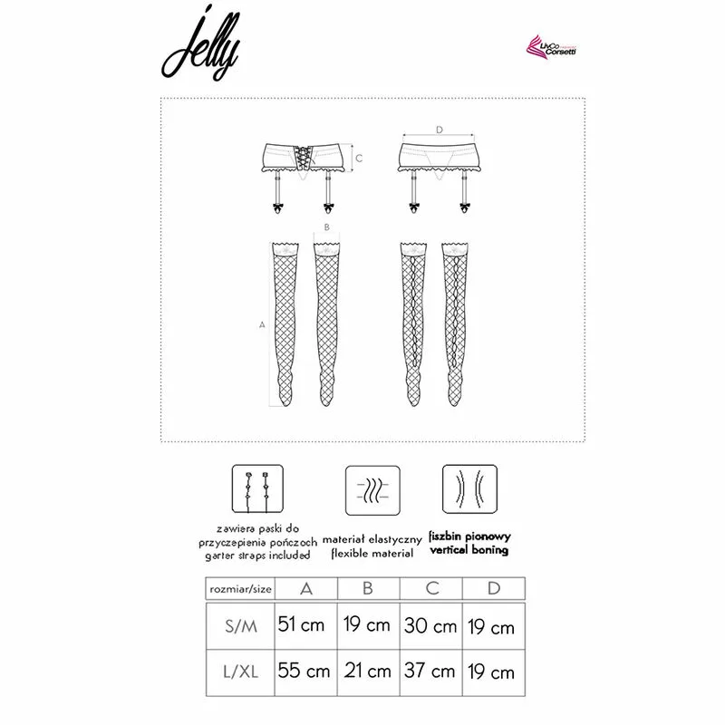 El liguero Jelly es un sensual conjunto de ropa interior de la colección LivCO Corsetti Fashion. Incluye liguero con medias. Todo está acabado en un elegante color negro. El liguero está hecho de encaje fino. Cubre el cuerpo desde las caderas hasta la cintura. Su anchura hace que parezca muy impresionante y moldea ópticamente la figura. El cinturón también tiene costuras verticales que le dan un carácter depredador y lo estilizan ópticamente. Los tentadores adornos en forma de inserciones diagonales de material brillante están adornados con elementos decorativos plateados. La parte delantera del liguero se cierra con cómodos ganchos. La atractiva espalda con abertura por encima de las nalgas está equipada con un cordón tipo corsé. Las medias de rejilla con malla grande se sujetan a la cintura con tirantes finos y ajustables. Su parte superior está decorada con encaje con adorno floral. El conjunto está fabricado en material flexible que se adapta a la forma del cuerpo y realza la figura.