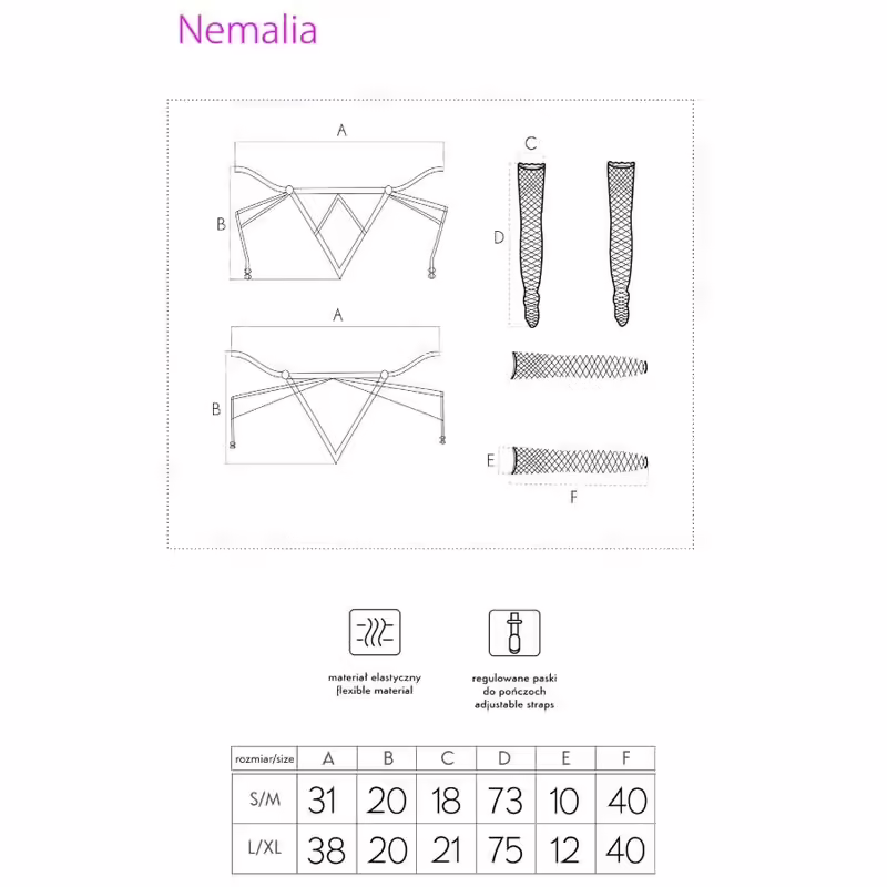 El set de liguero, medias y guantes Nemalia de la marca Livco Corsetti Fashion es la encarnación de la elegancia y la sensualidad. Diseñado para destacar la belleza natural del cuerpo femenino, este conjunto es ideal para ocasiones especiales o para añadir un toque sofisticado a tu lencería diaria.
