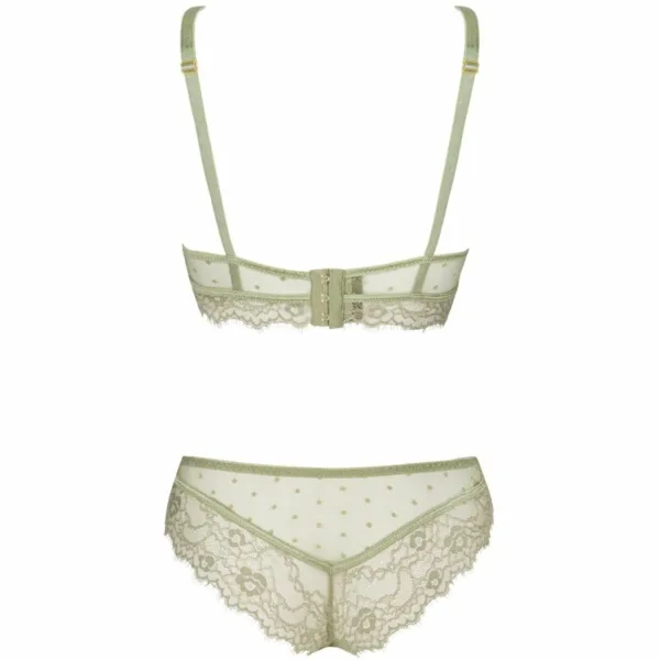 El conjunto de lencería es una obra de arte del encaje. El sujetador no está rígido y además está equipado con dos tirantes en el escote, por lo que seguramente llamará mucho la atención cuando se mire por debajo de una camisa o blusa. El sujetador sujeta bien el busto, lo que significa que las mujeres con senos más grandes también podrán usarlo. La ropa interior tentadora en color verde crudo también incluye braguitas de encaje cómodas y al mismo tiempo sensuales que, aunque son un poco más corpulentas, crean una atmósfera sexy. El diseño de las bragas resalta perfectamente los glúteos de las mujeres, haciendo que cada mujer se sienta especial. El conjunto es perfecto tanto para el día a día como para momentos un poco más especiales.