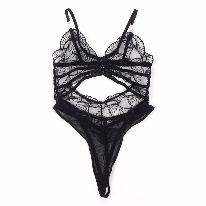 El diseño incorpora detalles de encaje transparente que aportan un toque de delicadeza y refinamiento, mientras que los cortes estratégicos hollow cut realzan la silueta, dejando entrever la piel de forma sutil y seductora. La combinación del encaje con el color negro, clásico y atemporal, añade un aire de misterio y sofisticación que no pasará desapercibido.